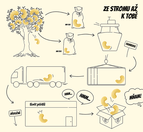 Jak vypadá cesta produktu ze zahraničí? Každý ořech a každé ovoce dozraje ve své domovině a sklízí se až plně vyzrálé plody. Následně se čistí a třídí do tzv. obchodních tříd podle jakosti a velikosti. Ne, opravdu neexistují stromy, které plodí jen ty největší kešu, to by přece nikdo nepěstoval žádné jiné! Pokud chceme například tunu nejvyšší obchodní třídy kešu, je třeba vytřídit osm tun ořechů.