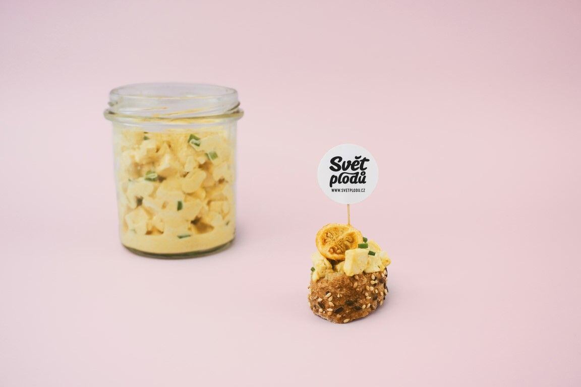 V míse si nejprve smícháme sojanézu a rostlinný jogurt. Použít můžete kešu, nebo ovesný – záleží jen na vás. Přidáme černou sůl, kurkumu, česnekový prášek a lahůdkové droždí. Tofu si nakrájíme na malé kostičky nebo rozmačkáme vidličkou. Přidáme do směsi v misce a promícháme. Jarní cibulku očistíme a nasekáme najemno. Má jemně štiplavé tóny a pomazánce dodá svěžest, takže s ní nemusíte šetřit! Pomazánku je dobré nechat v lednici alespoň dvě hodiny uležet. Pak si ji můžete namazat na oblíbené krekry.