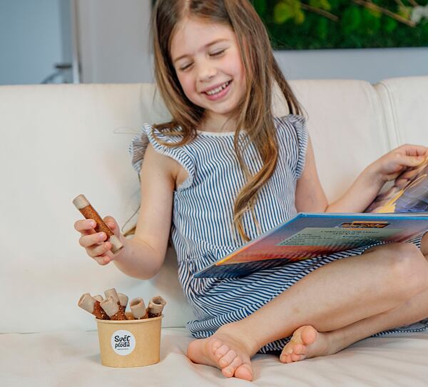 Věděli jste, že tyčinky začala Saša vyrábět právě kvůli dětem? Hledala zdravou a praktickou svačinu, která by dětem chutnala. S tyčinkami se jí to povedlo na výbornou! Máme ozkoušeno, že děti na svačinu do školy nejvíc milují ty ovocné. Ananasovou a mangovou, jahodovou a malinovou, vybírat můžete ale i z našich zdobených proteinek. Třeba taková kešukaramelka s čokomeruňkou se poslední roky tahají o prvenství v soutěži Miss tyčinka Světa plodů.