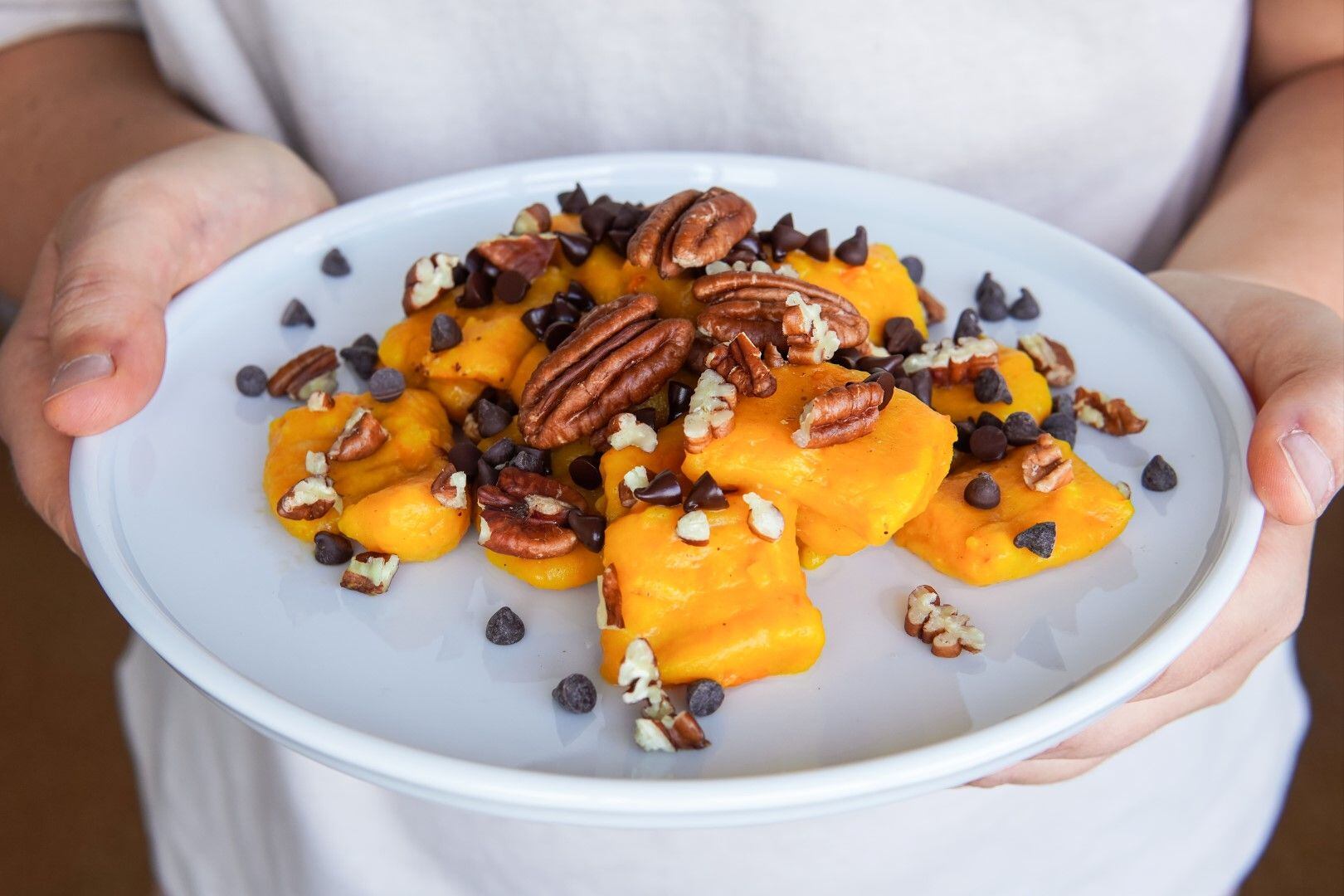 Dát si je můžete na sladko s pekanovými ořechy, hořkou čokoládou přelité javorovým sirupem, dýňové noky vám ale budou chutnat i se špenátem a výrazným sýrem nebo bylinkovým máslem. Dobrou chuť!