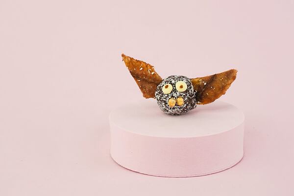 A teď to hlavní – kreativně se vyřádit! Na kuličky nalepíme čoko oči z bílé čokolády a přidáme zuby ze semínek. Křídla vyrobíme z přepůlených banánových plátků nebo třeba z kokosových zlomků v čokoládě.