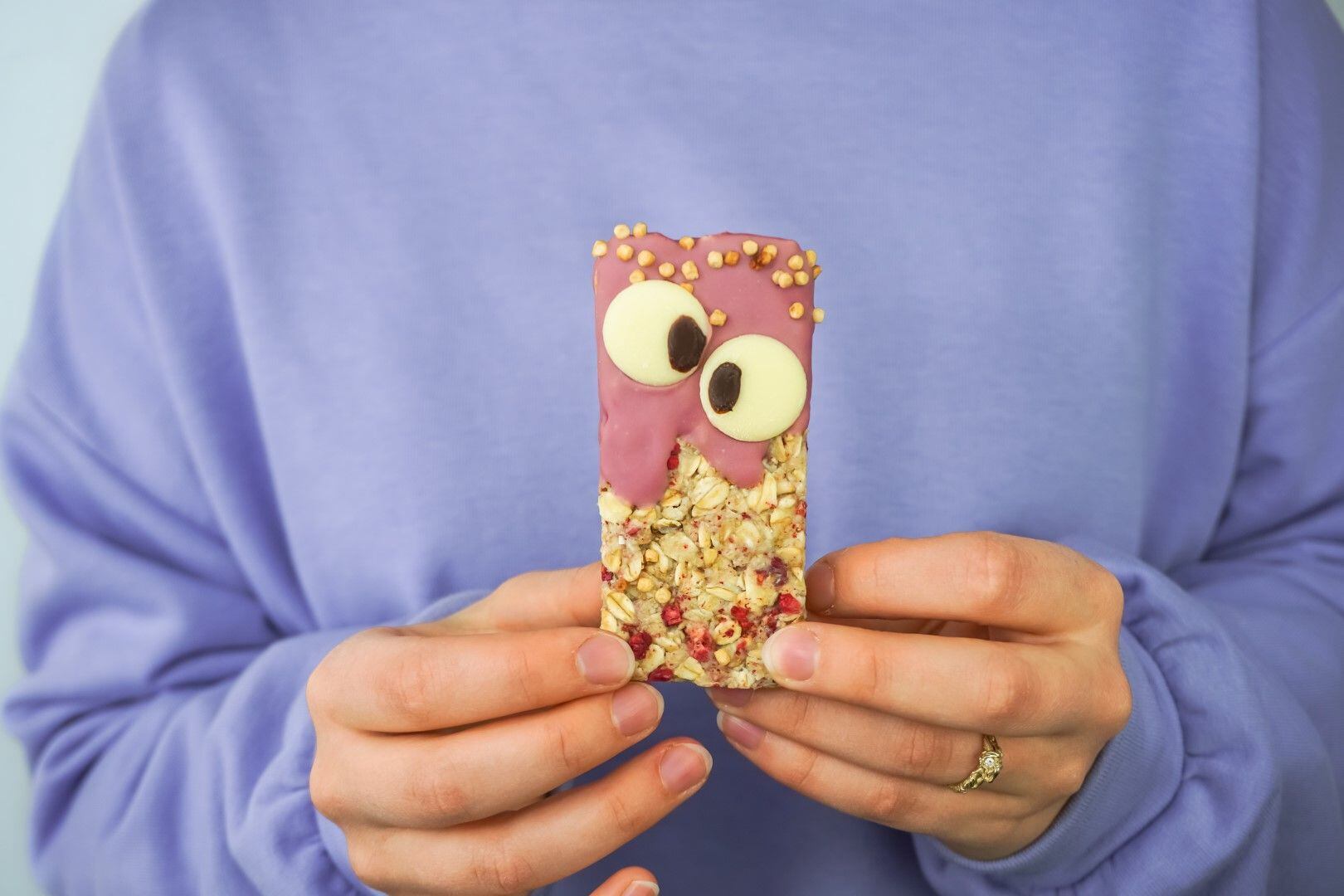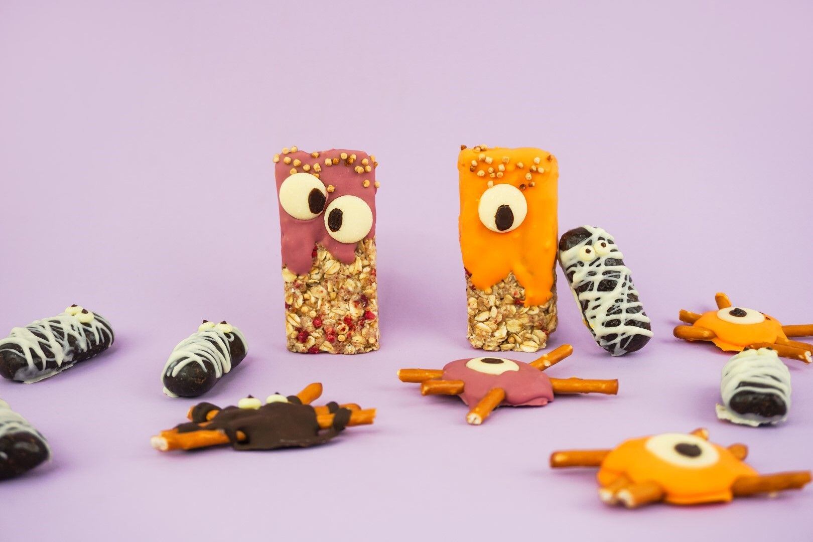 Dáme na 15 minut ztuhnout do lednice a mezitím si rozpustíme pomerančovou nebo ruby čokoládu s trochou kakaového másla. Ztuhlou hmotu nakrájíme na tyčinky o stejné velikosti a můžeme začít zdobit. Tyčinky můžete namočit v roztopené ruby nebo pomerančové čokoládě a ozdobit podle libosti. My jsme z nich udělali malá strašidýlka s čokoládovýma očima.