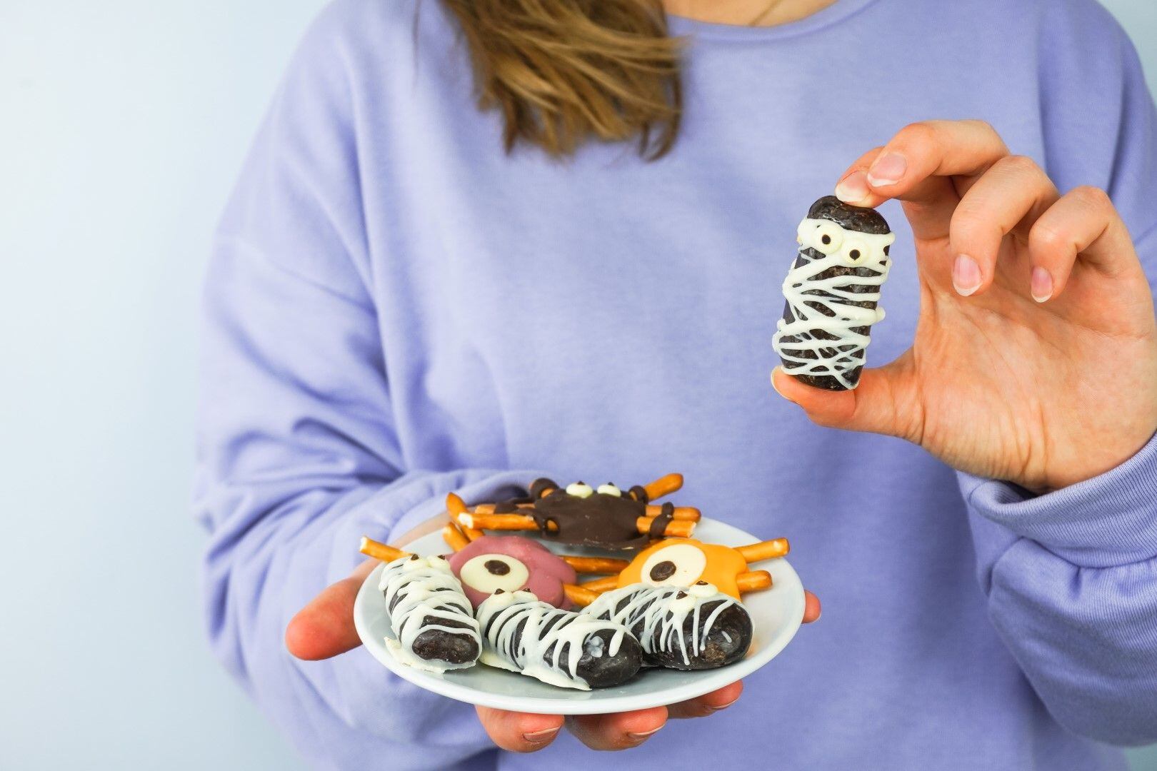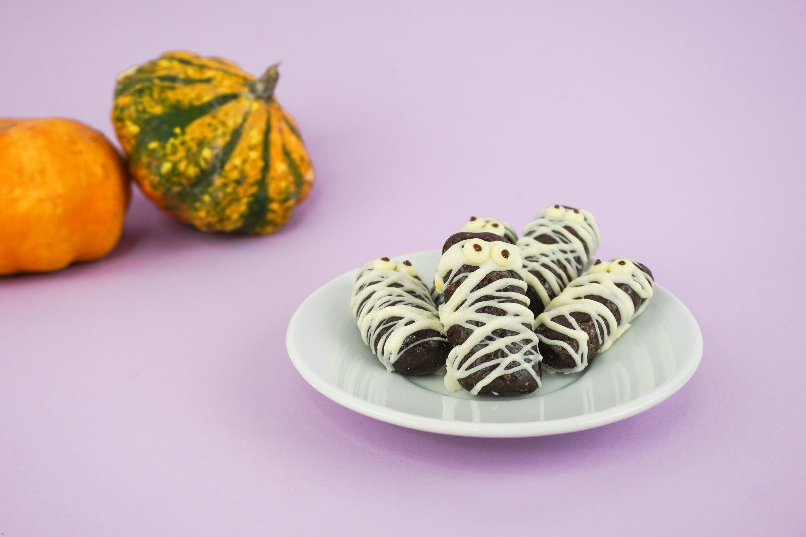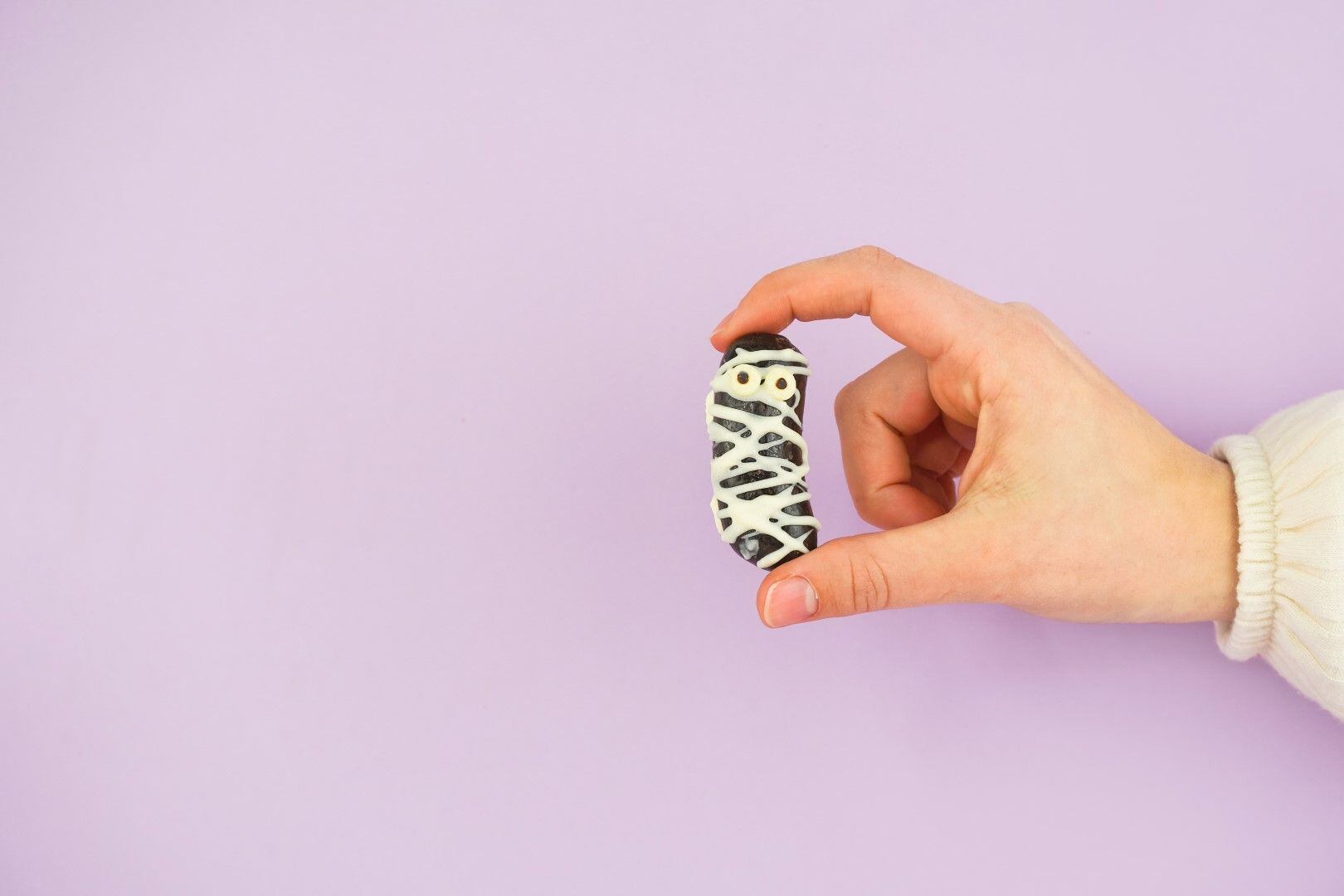 Banány v čokoládě stačí pocákat rozpuštěnou bílou čokoládou, jako by byly omotané obvazem, a přidat jim čokooči. Pokud chcete zdravější verzi, doporučujeme vyrobit halloweenské mumie ze sušených banánů bez čokolády – ty pravé sušené banány jsou totiž stejně ty tmavé!