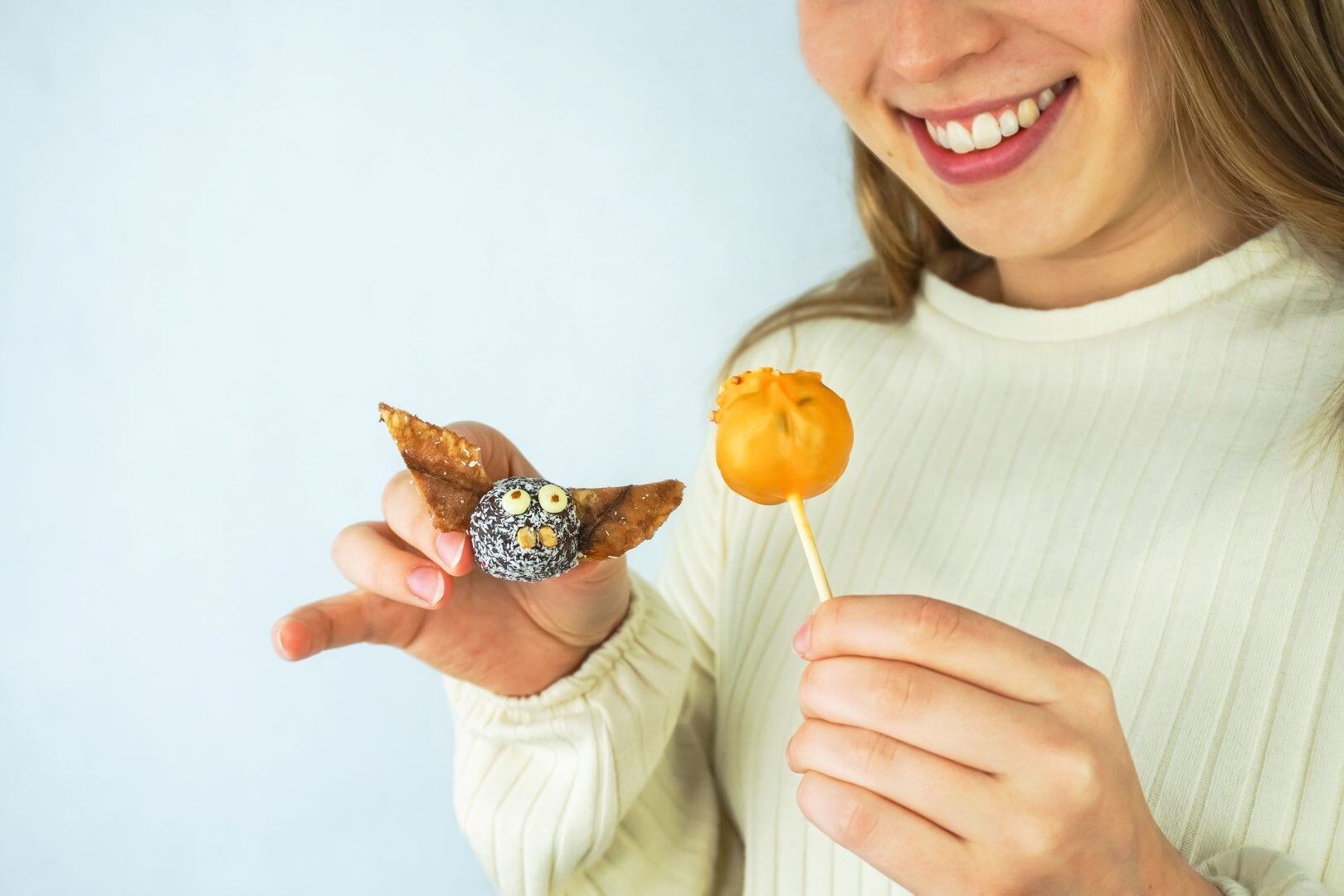 Z raw kuliček, které jsme připravovali na netopýry, můžete vytvořit také lízátka ve tvaru dýně.