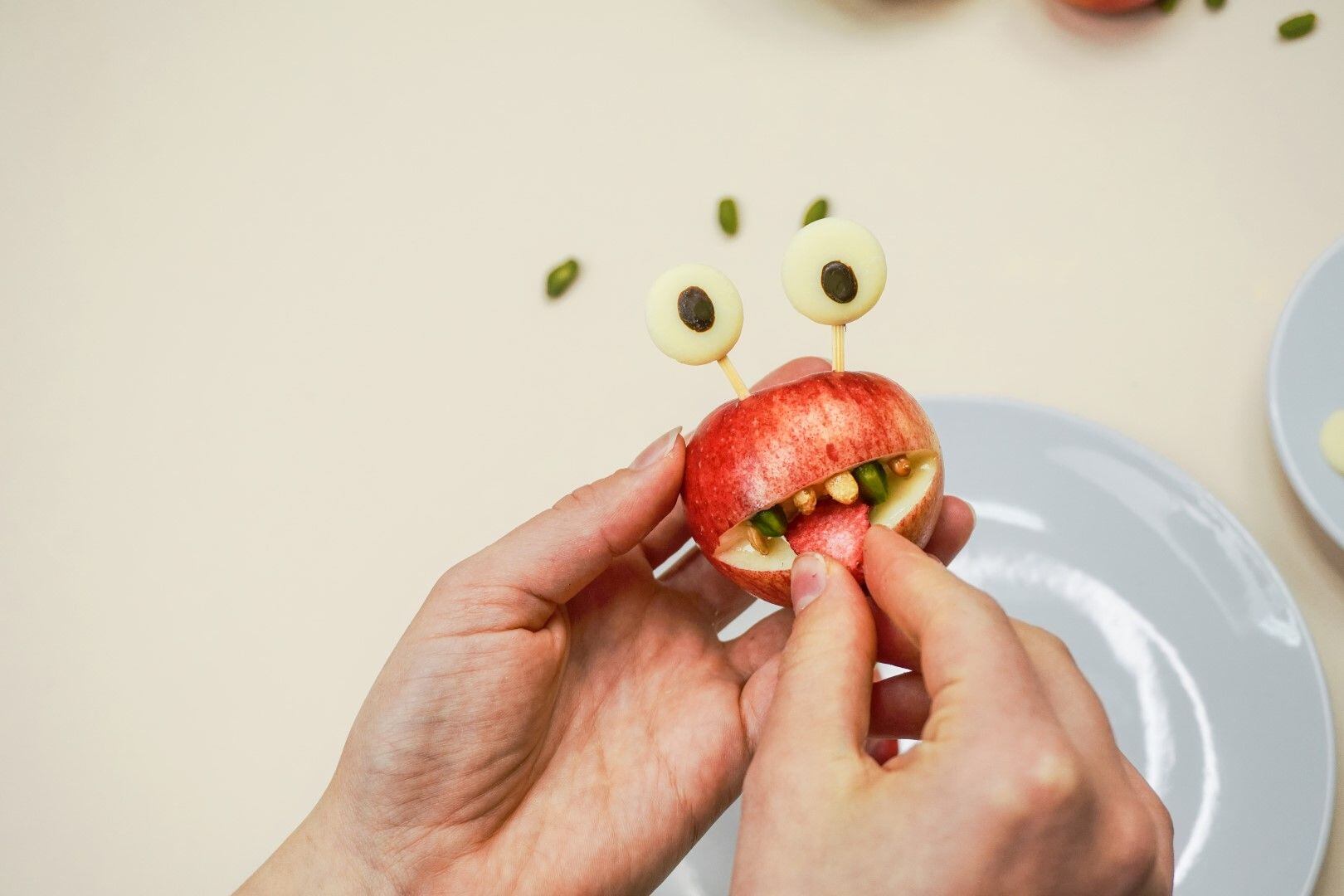 Jablíčko umyjeme a usušíme. V dolní třetině z jablíčka vyřízneme široký úsměv. Do horního patra zasadíme melounové zuby a pusu vyplníme ořechovým máslem. My jsme použili mandlové. Nakonec zastrčíme do pusy jahodový jazyk a zapíchneme čokoládové oči.