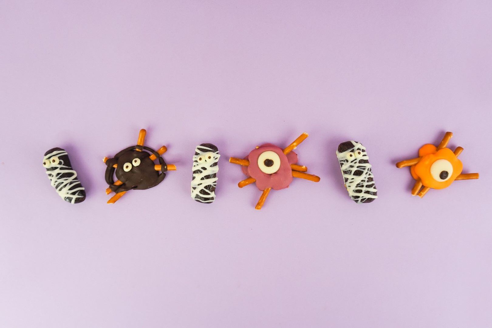 Tyčinky nalámeme na menší kousky a lžičkou plnou čokolády je zalijeme. Nakonec nalepíme na pavoučky čokooči a necháme ztuhnout asi 10 minut v chladu.
