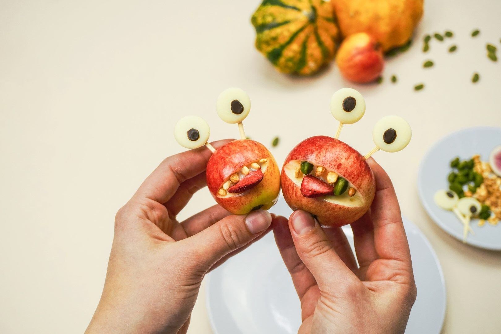 Zbytkem rozpuštěné čokolády zezadu můžete na pecky přilepit špejli, abyste vytvořili ještě zábavnější příšerky.