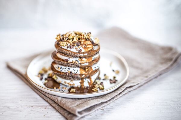 Lívance jsou geniální v tom, že si na talíři rozumí se spoustou dobrot. Makové lívance s tvarohovým krémem jsou skvělé v kombinaci se sušenými hruškami a lískooříškovým máslem. Jako posypání jsme zvolili kousky karamelu, kakaové boby a ještě špetku máku. Mňam!