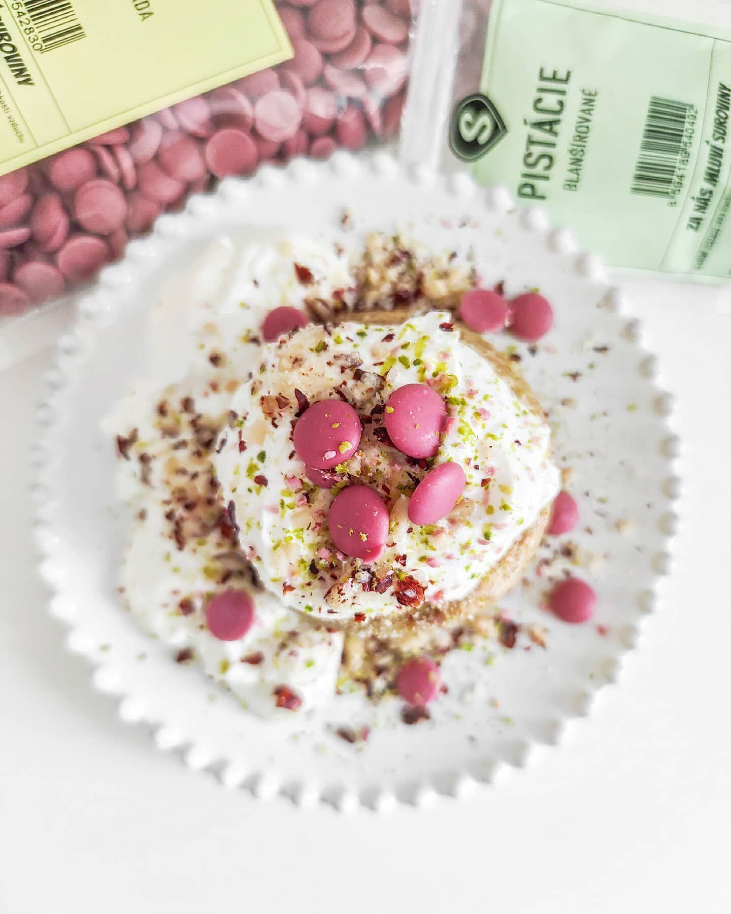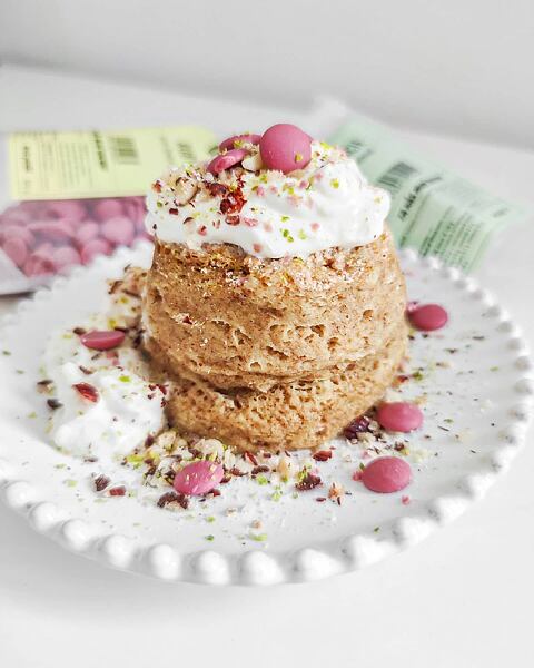V menší misce nebo hrníčku smícháme sypké ingredience, přidáme vajíčko, mléko a rozmačkaný banán. Vložíme do mikrovlnky na cca 5 minut. Mugcake po vyndání z mikrovlnky vyklopíme a nahoru dáme tvaroh, který ozdobíme ruby čokoládou, lískovými oříšky a pistáciemi. Mmmm!