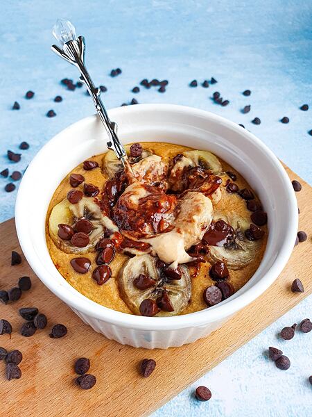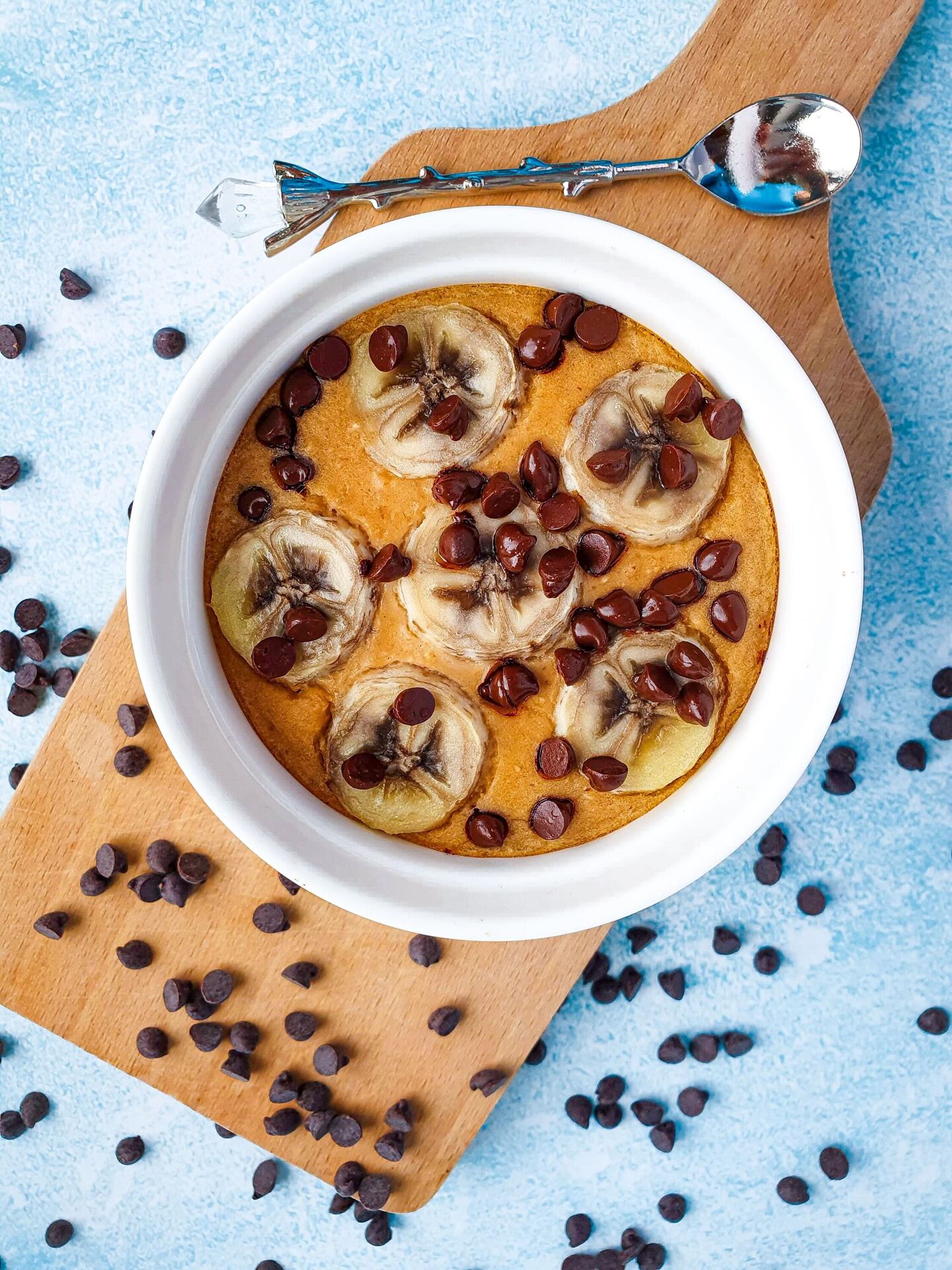 Vše promícháme a jednu polovinu těsta dáme do menší keramické formičky vymazané kokosovým olejem. Doprostřed dáme pecičky čokolády a zakryjeme zbytkem těsta a nahoru poklademe zbytek banánu nakrájeného na kolečka. Pečeme v předehřáté troubě na 180 °C asi 10 minut.