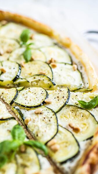 Následně zdobíme cuketou, kterou jsme si omyli a nakrájeli na 2 mm tenké plátky. Ty skládáme na sýrovou náplň přes sebe do kruhů. Postupujeme od kraje směrem ke středu.