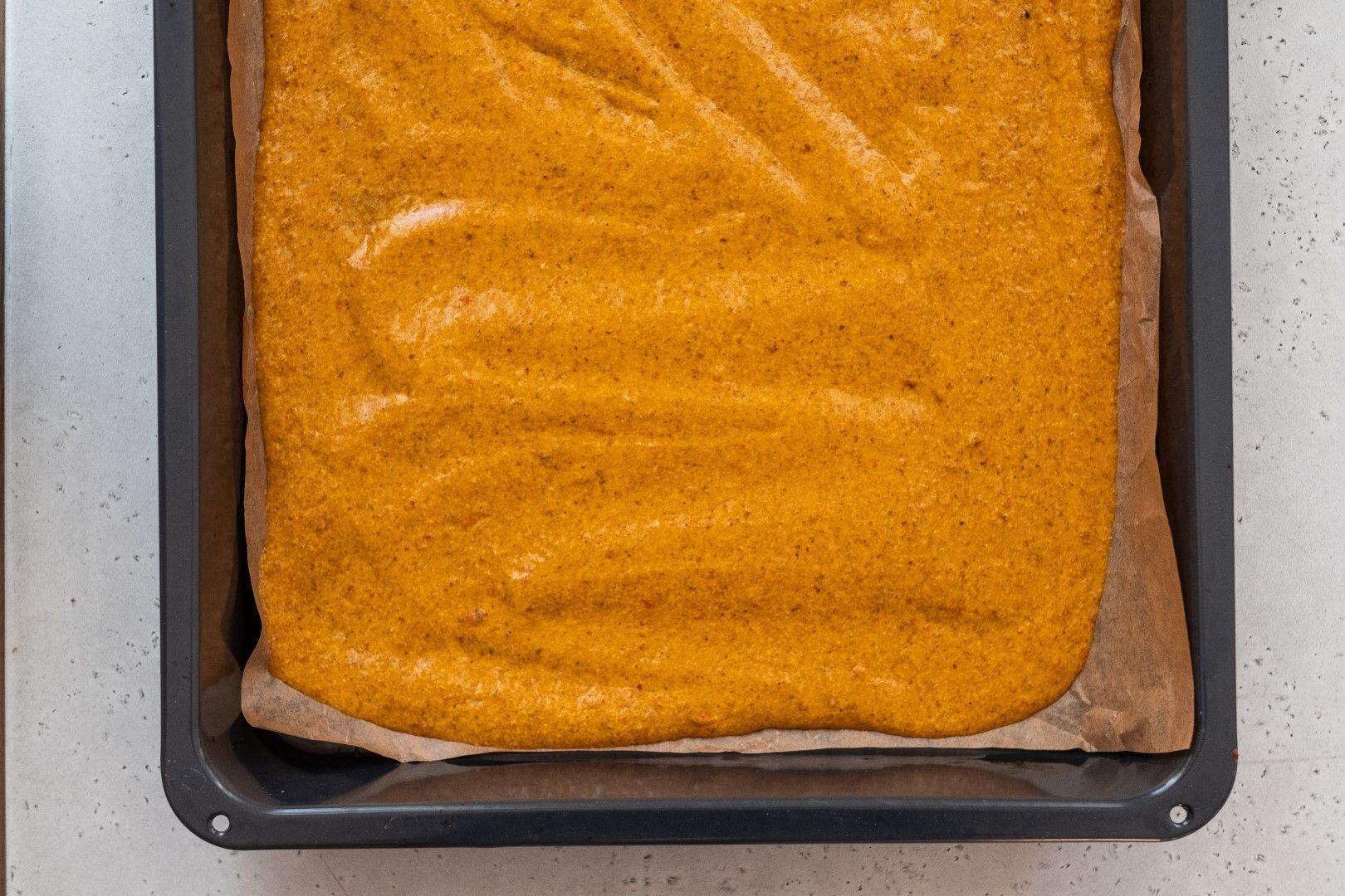 Těsto pak vylijeme na plech vyložený pečicím papírem a rozetřeme jej do všech stran. Vložíme do trouby na 18 minut.