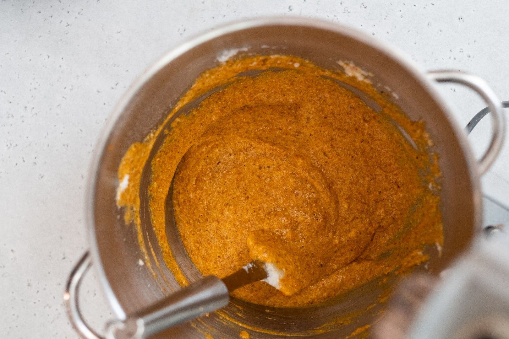 V druhé míse vymícháme spolu dýňové pyré, žloutky a oba cukry. Poté přidáme směs mouky a koření a nakonec opatrně vmícháme sníh.