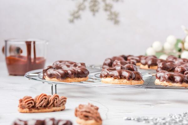 Vychladlé korpusy (rohlíčky) bohatě zdobíme krémem, který si přendáme do cukrářského sáčku. Poté si ve vodní lázni pozvolna rozpustíme hořkou čokoládu s kokosovým olejem. Rohlíčky v čokoládě namočíme a necháme zatuhnout. Rychleji zatuhnou v lednici nebo venku – pokud je chladno.