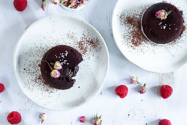 Nakonec Lava Cake přiklopte talířkem a otočte „vzhůru nohama“ – dortík tak hezky vypadne z formičky. Před podáváním valentýnský dezert posypejte kakaem a malou špetkou mořské soli, aby se zvýraznila bohatá chuť čokolády.