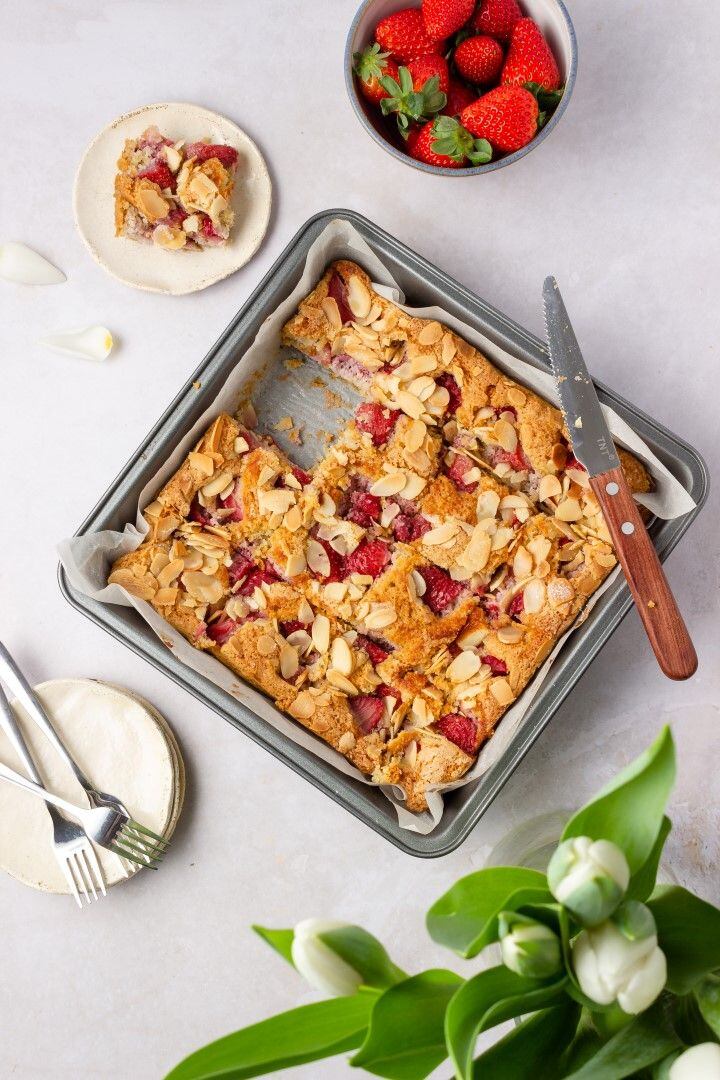 Nakonec po částech přimíchejte i rozpuštěné máslo. Těsto poté přemístěte na plech a bublaninu ozdobte jahodami a mandlovými lupínky.
