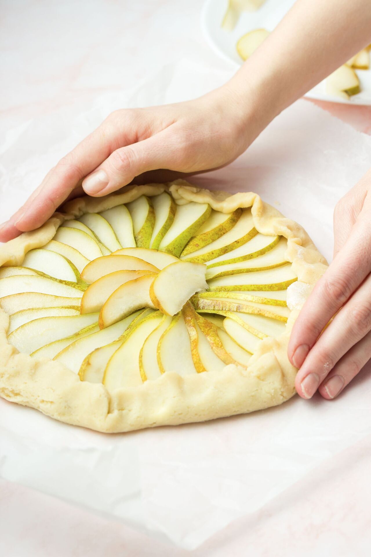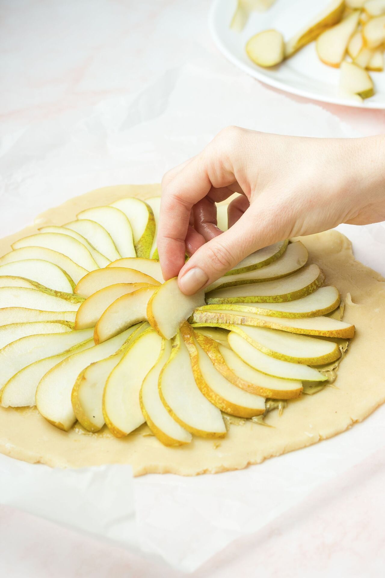 Odpočaté těsto na galetku vyválíme do kulatého tvaru na tloušťku asi 5 mm. Placku přendáme na plech vyložený pečicím papírem a potřeme pistáciovým máslem. Okraje galetky (asi 5 cm) necháme volné. Na máslo vyskládáme plátky hrušek, přes které pak přehneme okraje těsta.