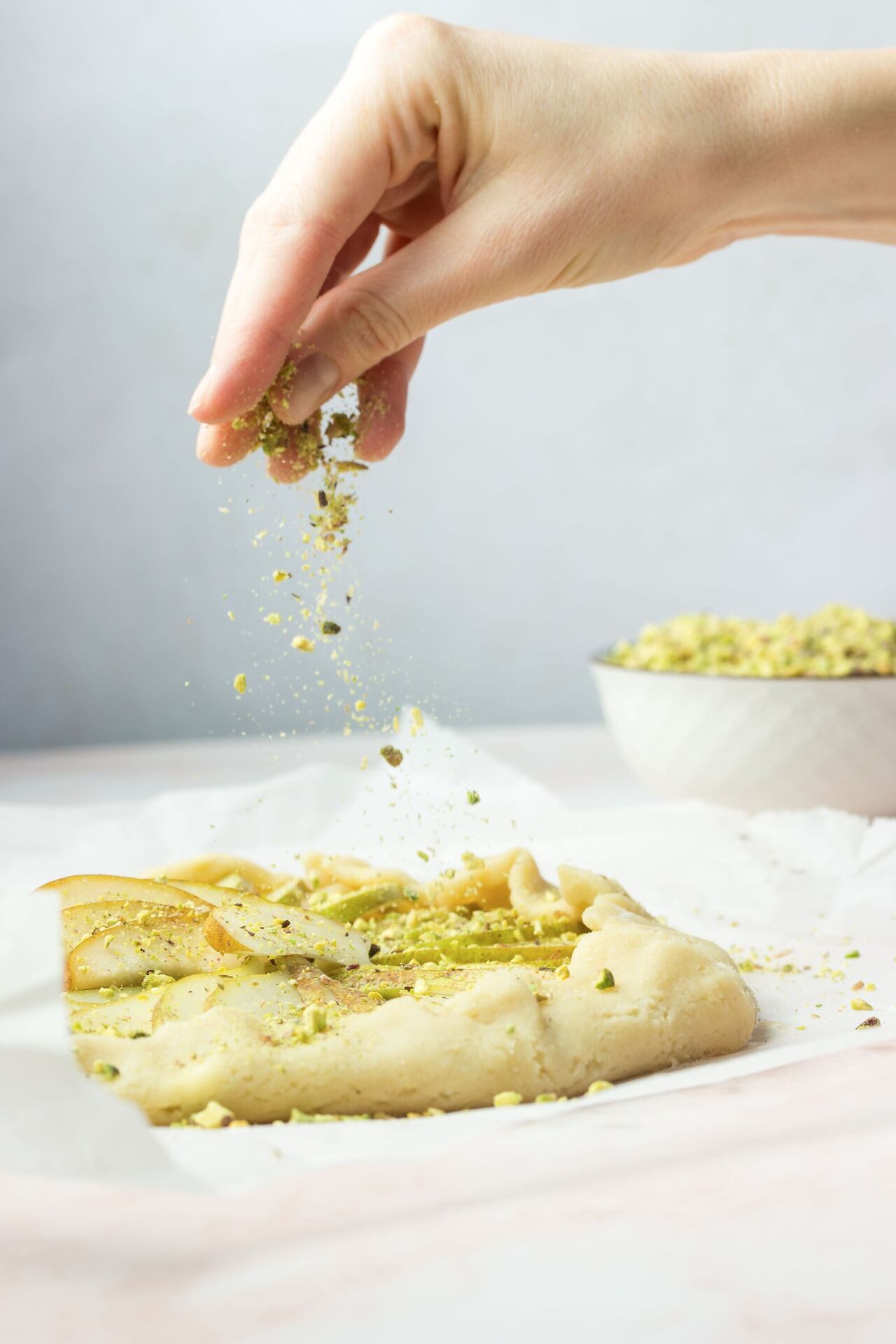 Okraje potřeme rozšlehaným vejcem a celou galetku posypeme pistáciemi. Pokud máte rádi hodně sladké dezerty, můžete přisladit cukrem nebo třeba agávovým sirupem. Zralé hrušky spolu s pistáciovým máslem však galetku hezky osladí.