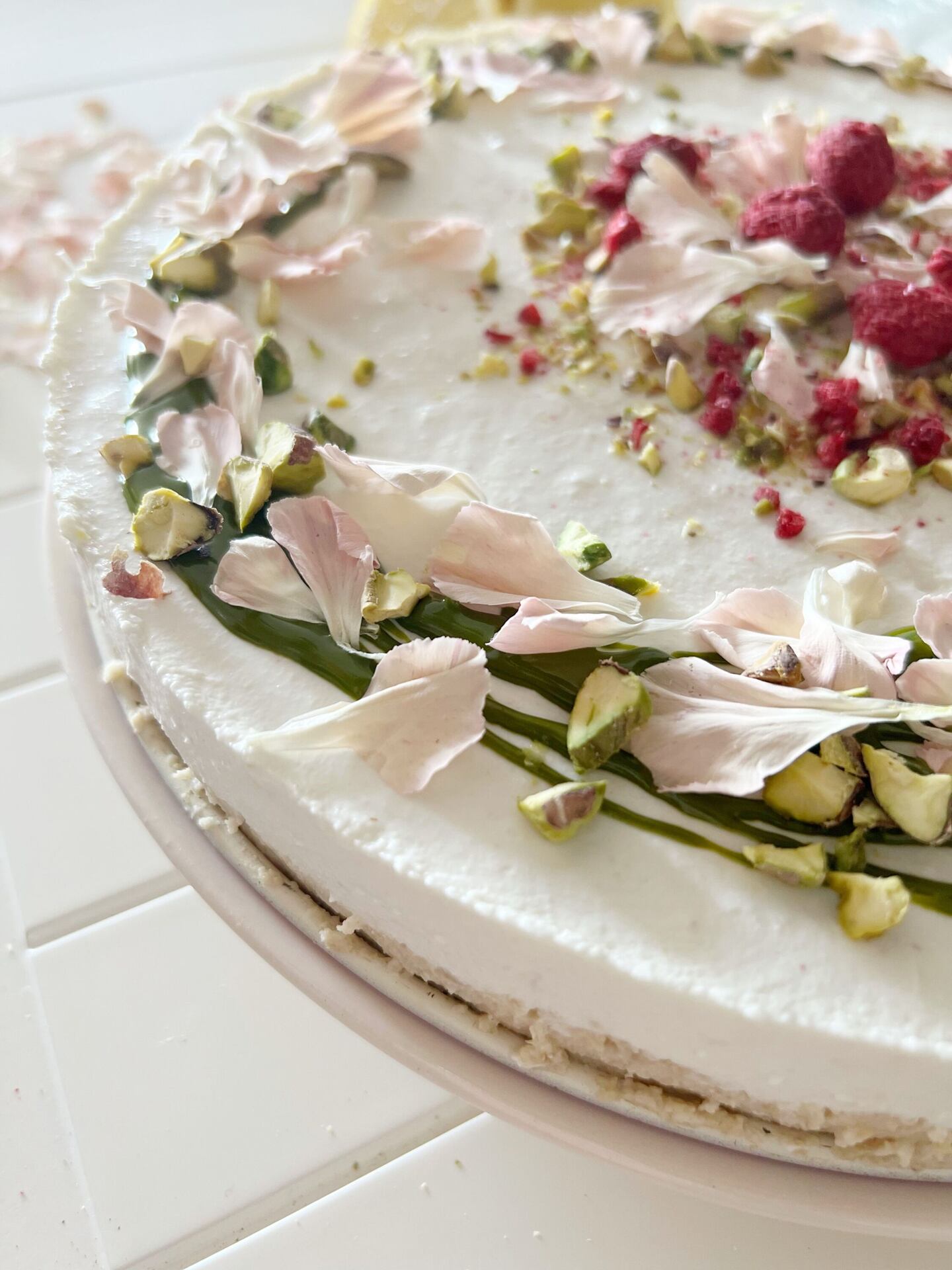 Hotový citronový cheesecake ozdobíme pistáciovým máslem, nasekanými pistáciemi, lyofilizovanými malinami a jedlými květy.