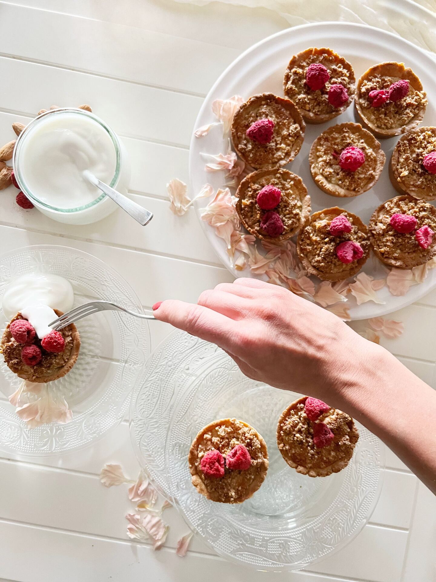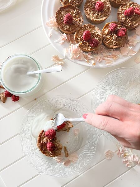 Po upečení necháme košíčky vychladnout a poté zdobíme čerstvými nebo lyofilizovanými malinami. Podáváme s kopečkem bílého jogurtu (nebo veganské alternativy) nebo zakysanou smetanou.
