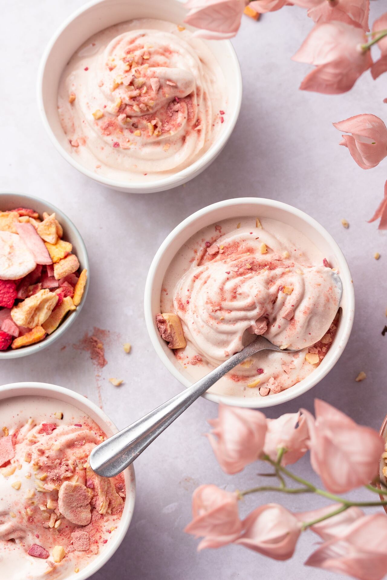 Jogurt můžete ochutit podle vlastní fantazie! My doporučujeme drť z lyofilizovaného ovoce. To si totiž díky sušení mrazem uchovalo svou chuť, barvu i vitamíny a na rozdíl od čerstvého ovoce vám jogurt nenaředí šťáva, takže bude i po zamrazení krásně krémový.