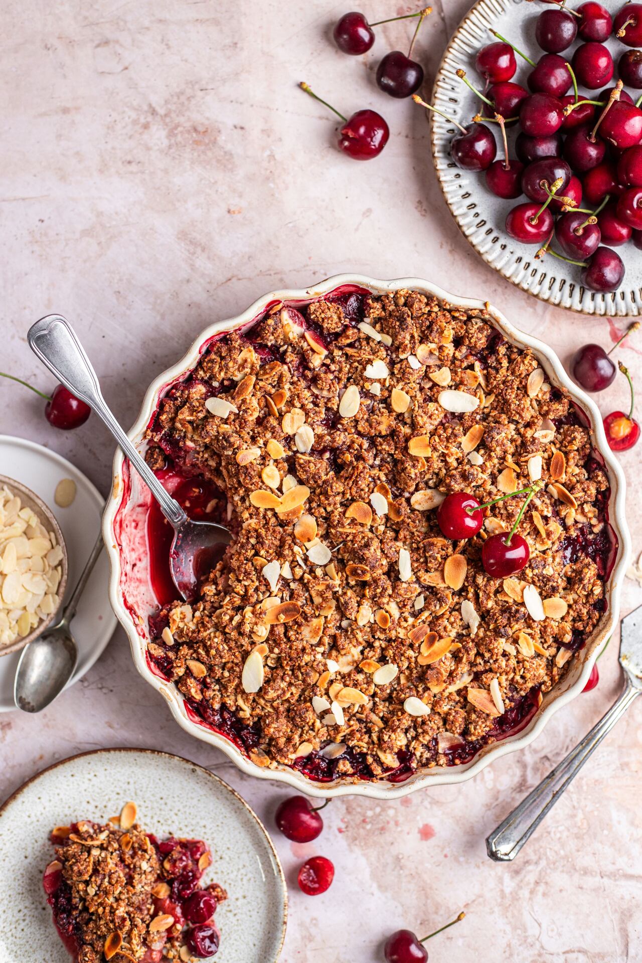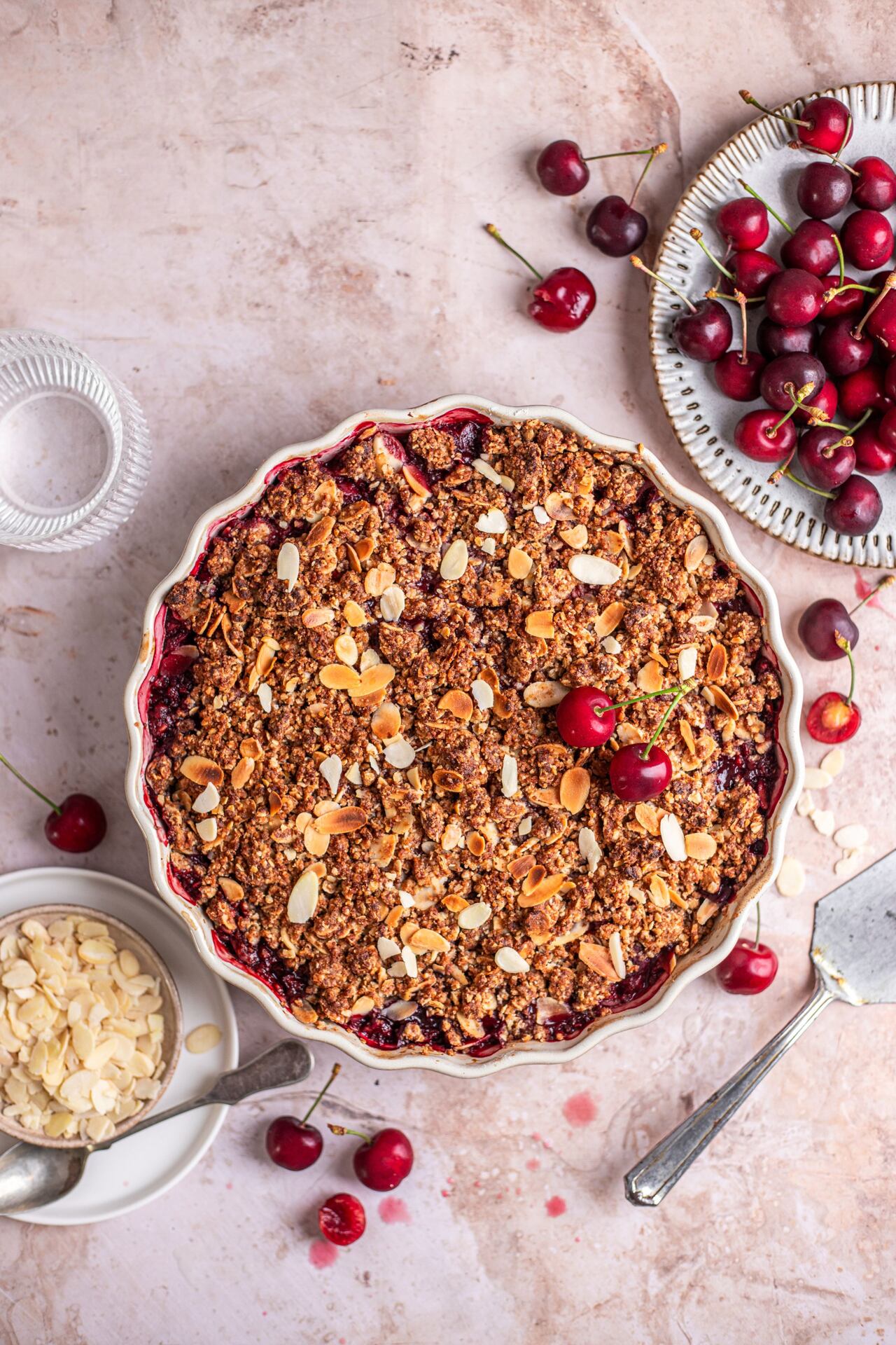 Ovoce přendejte do formy a posypte drobenkou. Vložte do předehřáté trouby na 40 minut. Během pečení crumble kontrolujte, aby se vršek nepřipálil. Pokud by byl až moc hnědý a ovoce stále tuhé, přikryjte ho alobalem a pečte dále. Správně upečený crumble má být na vrchu křupavý a ovoce měkké, šťavnaté a plné chuti.