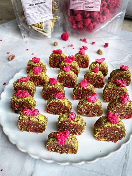 Pistácie rozmixujeme a smícháme s datlovou pastou (část pistácií si necháme na ozdobu), rozdrcenými malinami a citronovou šťávou.