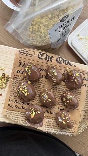 Ve vodní lázni rozpusťte čokoládu a plněné datle do ní celé ponořte. - Ozdobte pistáciovými kousky