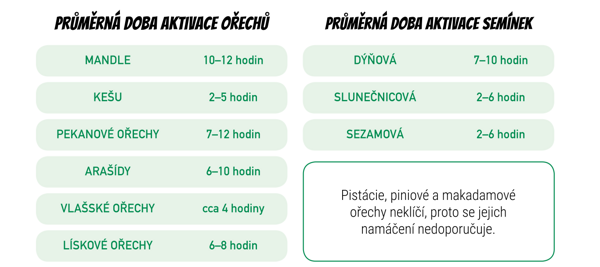Doba aktivace se u jednotlivých druhů ořechů liší, což je způsobeno jejich odlišnou konzistencí a velikostí. Nejkratší dobu potřebují k aktivaci kešu, naopak nejdelší namáčení vyžadují mandle, kterým to trvá až 5× déle. Průměrnou dobu namáčení ořechů a semínek jsme sepsali do tabulky: