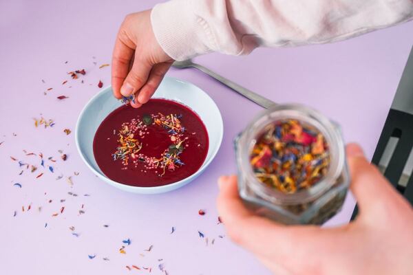 Polévku vymixujeme tyčovým mixérem, až se z ní stane hladký krém. Na závěr ji ozdobíme opraženými semínky – využít můžete konopná, dýňová nebo pinie. Pražte je nasucho a jen chvíli, než se rozvoní na pánvi. Na závěr polévku ještě posypte jedlými květy a zakápněte olivovým olejem. Mňam!