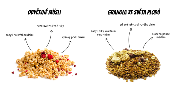 Granola Kakao i Granola Skořice jsou vlastnoručně vyráběnými výrobky Světa plodů. Obě obsahují ovesné vločky bohaté na vlákninu, doslazené jsou medem a díky troše olivového oleje obsahují i zdravé tuky. Granoly neobsahují žádný ztužený tuk ani umělá barviva.
