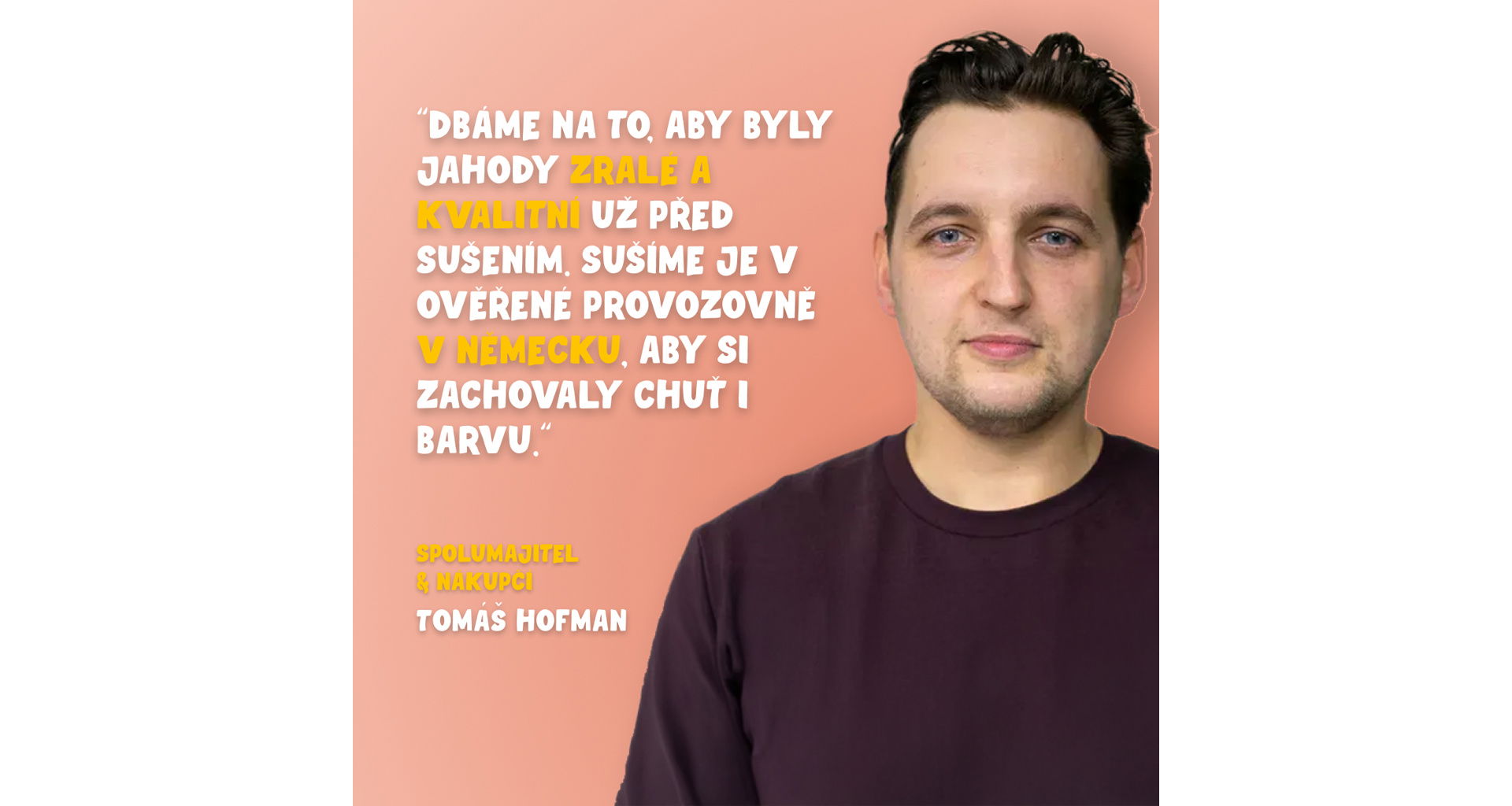 „Oceňuji zejména kvalitu jahod před jejich usušením. Pokud by byly jahody před sušením nahnilé nebo naopak nedozrálé, projevilo by se to na kvalitě výsledného produktu. Nakupuji jahody, které buď dozrály ve stejné zemi, ve které je také usuší, nebo putují do Evropy ve zmrazeném stavu, aby po cestě nedocházelo k jejich kažení. Sušení mrazem pak probíhá v osvědčené provozovně v Německu.“