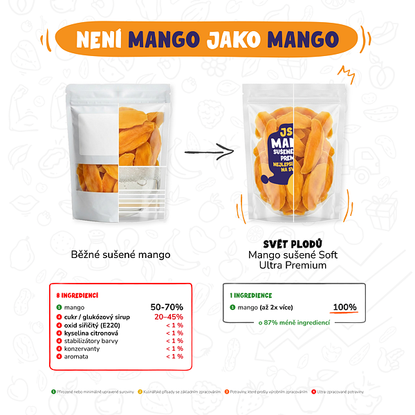 "Naše sušené mango v ultra prémiové kvalitě pro vás dovážíme z Vietnamu. Pěstují jej bez použití fytohormonů, pesticidů a jiných chemických látek. V Asii mango vypěstovali, zpracovali a šetrně usušili. Díky tomu nepřevážíme po planetě zbytečně vodu. Podobně jako u manga dbáme na kvalitu zpracování také u našeho dalšího sušeného ovoce."