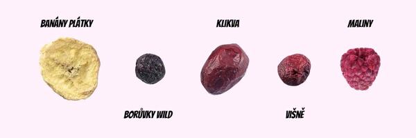 Tento MYX jsme připravili přímo ve Světě plodů. Přimíchali jsme do něj 30 % lyofilizovaných plátků banánu, 20 % lyofilizovaných malin, 20 % lyofilizovaných višní, 15 % lyofilizovaných borůvek a také 15 % lyofilizované klikvy. Všechny ingredience jsme pečlivě ochutnali a myslíme si, že spolu neskutečně dobře ladí. MYX obsahuje různé chutě, a tak si každý přijde na své.