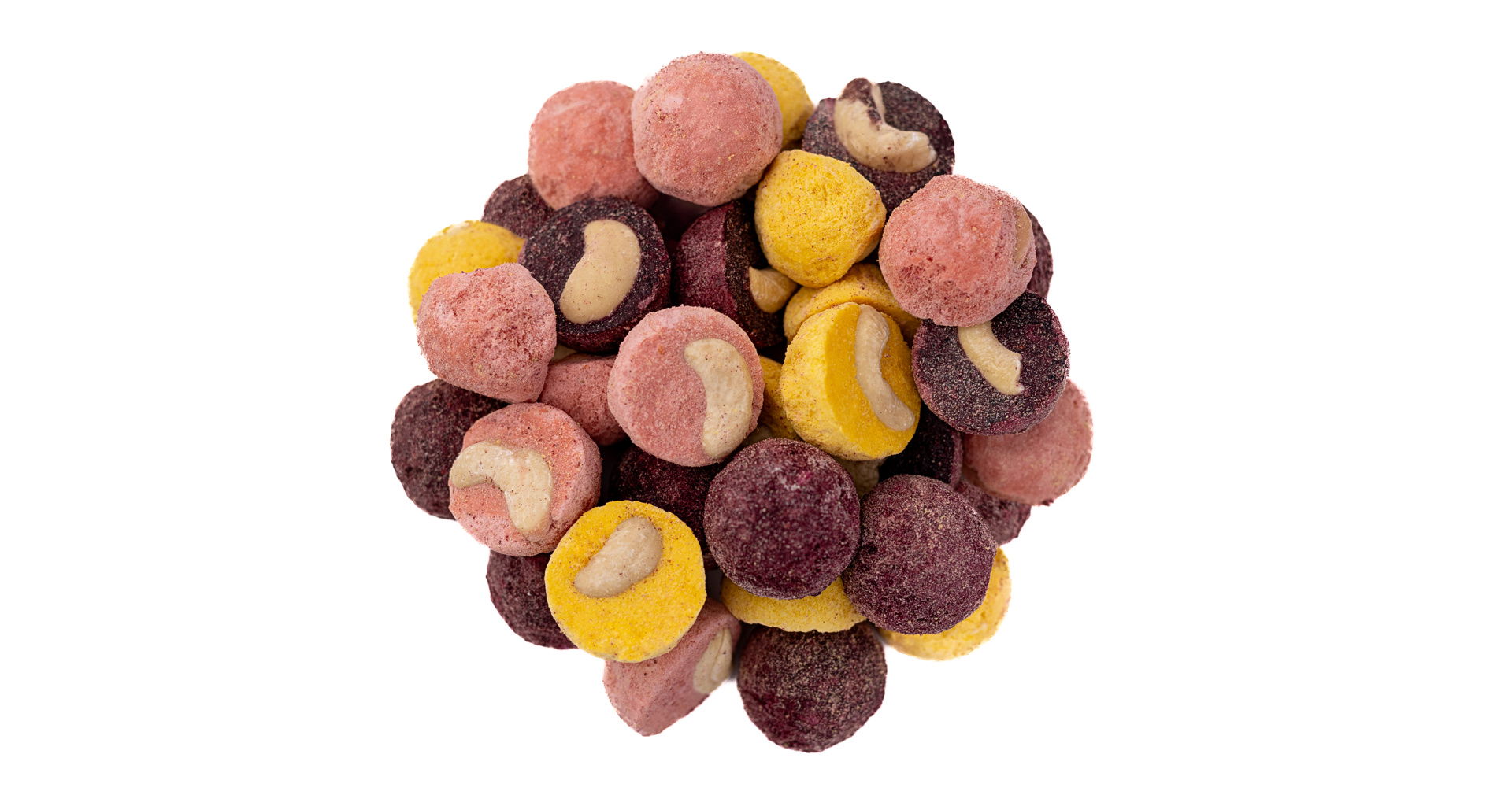 A já se Ti nerozteču, no není to paráda? Taková zmrzlina tu ještě nebyla. Křupavá, ale rozplývající se na jazyku. Sušili mě totiž mrazem. Navíc skrývám překvapení - krémový kešu oříšek v mangové nebo borůvkové krustičce.