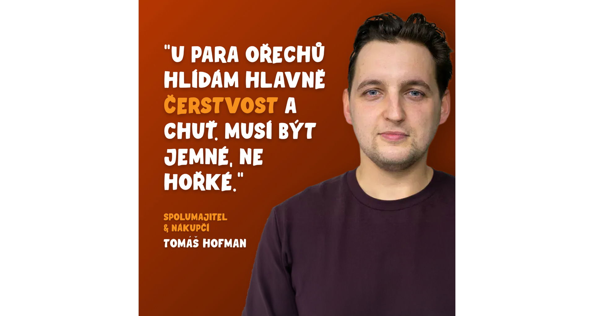 „Tento rok se úrodě některých ořechů dařilo natolik, že jsem se rozhodl zařadit do nabídky i menší velikosti, než které hledám běžně. Cena těchto ořechů klesla díky nadúrodě a byla by proto škoda nenakoupit tak kvalitní surovinu za tak nízkou cenu. Využil jsem této dostupnosti, a pokud vám nezáleží na velikosti, pochutnáte si na tomto ořechu stejně jako na těch větších! Jsou stejně chutné i křupavé a na kulinářské využití nebo svačiny se hodí perfektně.“