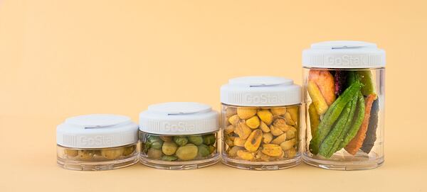 Sváčonosič má na výšku 23 cm a se skládá ze 4 různě velkých pater, která lze jednoduše kombinovat. Největší krabičky mají objem 150 ml a 100 ml a jsou ideální na větší sušené ovoce, jogurt nebo třeba hummus. V naplněném sváčonosiči v nich najdete Vegbites Chips a MYX Mexico.